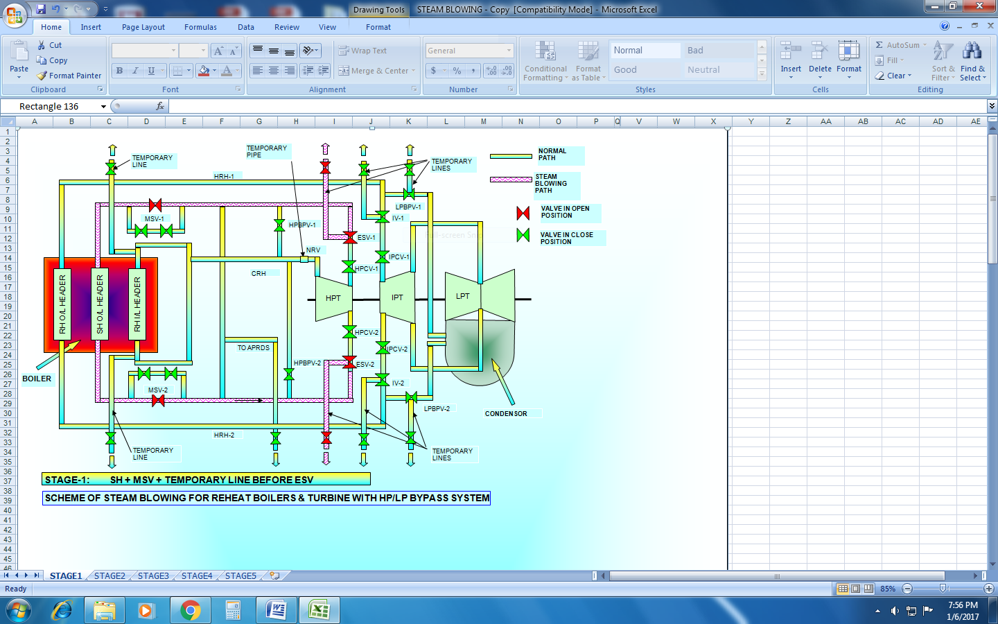 First steam blow for each of stage 1a, 1b, 1c, 2a & 2b is given at a lower pressure (Drum pressure 25 kg / cm2) and the pipe lines including temporary piping are surveyed for proper expansion and supports. Subsequent blows are given at 50 kg / cm2 Drum pressure.