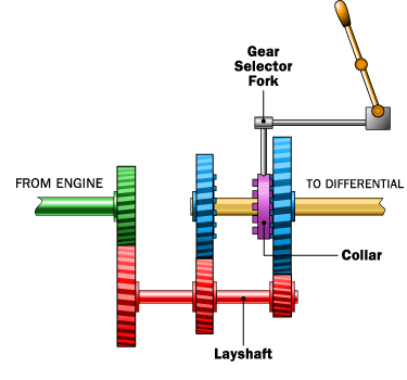 · The red shaft and gears are called the layshaft. These are also connected as a single piece, so all of the gears on the layshaft and the layshaft itself spin as one unit. The green shaft and the red shaft are directly connected through their meshed gears so that if the green shaft is spinning, so is the red shaft. In this way, the layshaft receives its power directly from the engine whenever the clutch is engaged.