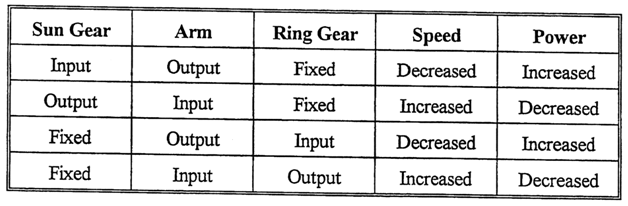 Like a compound gear train, planetary trains are used when a large change in speed or power is needed across a small distance. There are four different ways that a planetary train can be hooked up.